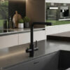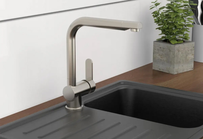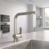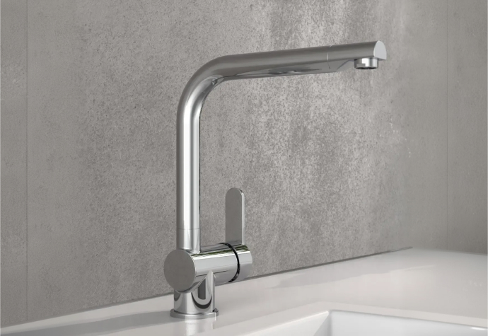 Grifo extraíble con rotación de 360° ofrece total libertad de movimiento en la zona de trabajo. Equipado con apertura en frío, evita consumos innecesarios de agua caliente y contribuye al ahorro energético. Disponible en 3 acabados.