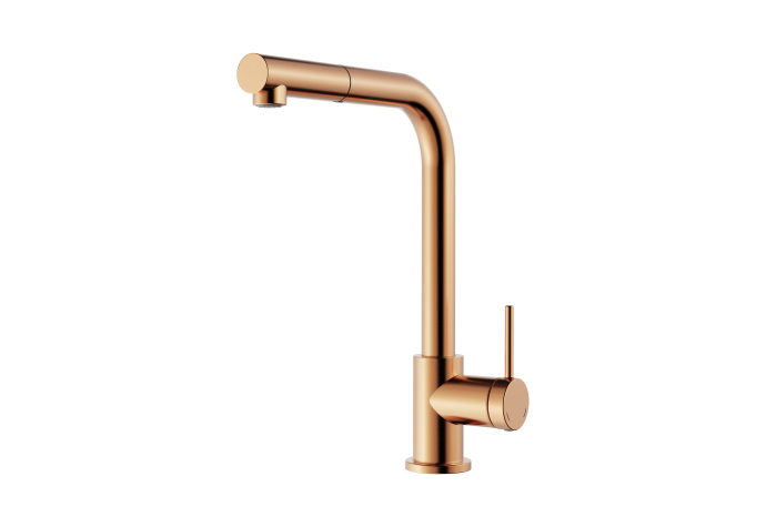 Pack compuesto por cubeta bajo encimera y grifo extraíble. Disponible este pack en acabado cobre mate, negro inox y oro mate. Mismo acabado para una combinación perfecta. Diseño de Radio 10 para líneas modernas y limpias.